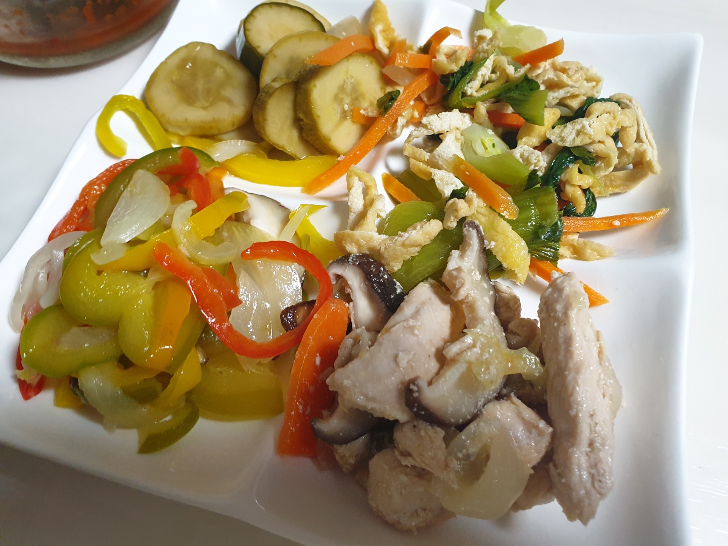 한번에 8개의 반찬이 와서, 끼니 때 4개 반찬씩 번갈아서 먹고 있어요.